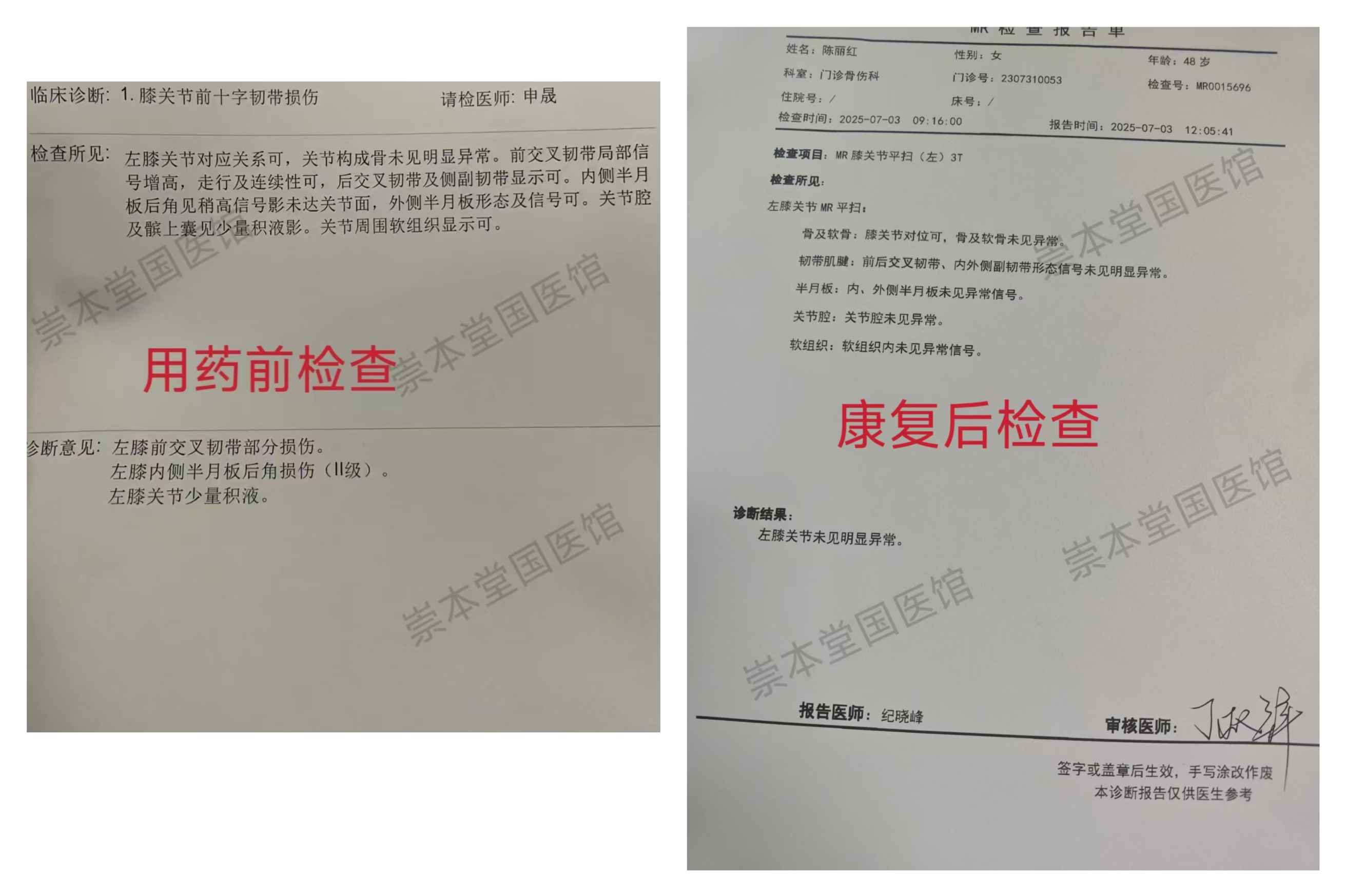 大体情况:左膝盖内侧半月板后角变性,左膝关节腔內少量积液,左膝盖前交叉韧带损伤,左侧股骨外侧髁骨旁皮下软组织內少许渗出。治疗了很多地方,各种方式都尝试过,直到用了【中医经方治骨】经过老师的指导调理,试着用了半个月,改善很明显,用完了2个月,平时自己也很注意,经常活动活动,膝关节就没怎么疼过了...”后期检查左膝关节诸组成骨骨质结构完整,密度如常,未见骨质增生及破坏,周围软组织也未见肿胀。